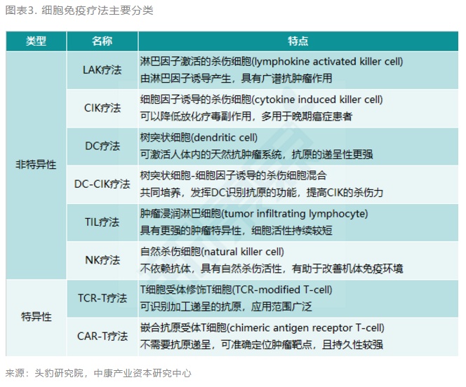 细胞免疫疗法经历了较长的发展历程,早在1982年,美国医生Grimm等在外周血单核细胞中,加入IL-2体外培养,诱导出LAK(淋巴因子激活杀伤细胞),可以杀伤对CTL(细胞毒性T淋巴细胞)、NK(自然杀伤细胞)不敏感的癌细胞。此后,TIL(肿瘤浸润淋巴细胞)、CIK(细胞因子诱导杀伤细胞)、CAR-T(抗原嵌合受体T细胞)被陆续发现。目前,细胞免疫疗法可分为非特异性和特异性两大类(图表3)。