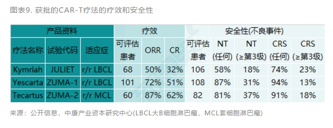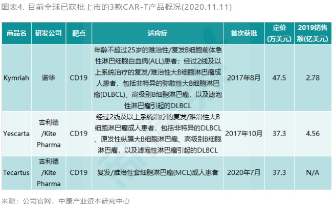 CAR-T疗法,作为最新一代的细胞免疫疗法,近几年在临床上得到了概念确证,商业价值正在显现。2017年8月,诺华上市Kymriah,用于治疗急性淋巴细胞白血病(ALL)。同年10月,吉利德旗下的KitePharma上市Yescarta,用于治疗复发或难治性大B细胞淋巴瘤。2020年7月,Kite Pharma的Tecartus获得FDA批准,用于治疗复发或难治性套细胞淋巴瘤(MCL)(图表4)。