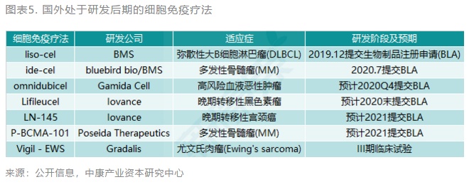 除了以上3款产品,还有多款细胞免疫疗法项目处于研发后期,即将上市。随着更多细胞免疫疗法产品的上市,很可能将极大地改变多种肿瘤的治疗标准(图表5)。