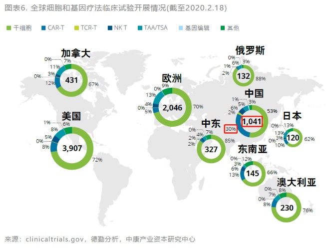 得益于政府政策扶持,在VC/PE投资的支持下,中国的细胞疗法研发欣欣向荣,大有赶超国际先进水平的趋势。2017年12月和2018年1月,先后有4款CAR-T疗法的临床试验申请(IND)被纳入优先审评,包括:传奇生物BCMA靶向CAR-T疗法LCAR-B38M、科济生物的GPC-3靶向CAR-T、北京马力诺的CD19靶向CAR-T,以及上海恒润达的CD19靶向CAR-T。传奇生物的LCAR-B38M在2019年12月被美国FDA 授予突破性疗法认定之后,又在2020年8月成为中国首个被拟纳入突破性治疗药物审评工作程序的品种。目前,中国发起的CAR-T临床试验数量已经超越美日欧成熟医药市场,居于全球首位(图表6)。