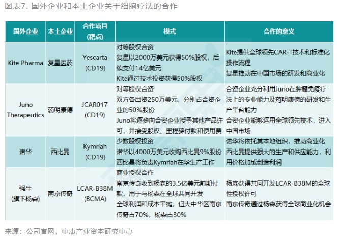 在中国市场上,除了本土生物技术公司积极进行细胞免疫疗法研发,国外企业也在加快与本土企业合作,通过合资企业、授权许可开展合作,从而获取本地化的研发、生产和商业化能力,加快产品上市速度。这种合作包括复星医药(02196)和Kite Pharma(凯特)、药明康德(02359)和Juno Therapeutics(巨诺),以及西比曼和诺华(Novartis,NVS.US)。南京传奇生物和强生(JNJ.US)(旗下杨森)的合作则是侧重于本土创新技术的向外授权,借助强生遍布全球的资源,实现全球商业化(图表7)。2020年3月,复星凯特的益基利仑赛注射液(即Yescarta)的中国上市申请被纳入优先审评。2020年9月,药明巨诺(02126)的CD19靶向CAR-T瑞基仑赛注射液(基于JCAR017研发的JWCAR029)被纳入突破性治疗品种,其中国上市申请被纳入优先审评。