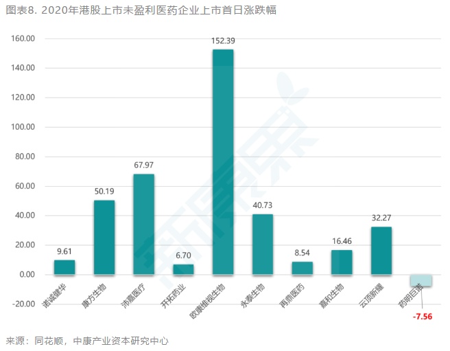 2020年11月3日,药明康德与JunoTherapeutics对等股权投资创办的药明巨诺(JW Therapeutics)在港交所挂牌上市,发行价每股23.8港元,当日以22.00港元收盘,较发行价下跌7.56%。截至目前,在2020年10家登陆港股的未盈利医药企业,仅有药明巨诺在上市首日破发(图表8)。