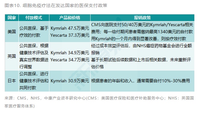 围绕细胞免疫疗法的最大争论是其高昂的价格。目前已经商业化的疗法的价格分别为37.3万到47.5万美元,但是如果考虑应用和管理这些疗法的医疗成本,每位患者的花费可能增加到100万美元。生物制药公司常以细胞免疫疗法的潜在治愈属性,及其针对的临床需求,为高昂的定价进行辩护。在真实世界环境中证明细胞免疫疗法的疗效将是关键,这有利于将其纳入国家医保或商业健康险。由于细胞免疫疗法的高价,目前只在部分发达国家被纳入医保(图表10)。
