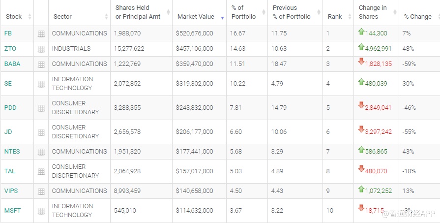 其中,Facebook(FB.US)位列第一,占比16.67%,持仓约198.81万股,持仓市值约5.21亿美元。较上季度持仓数量增持了7%。