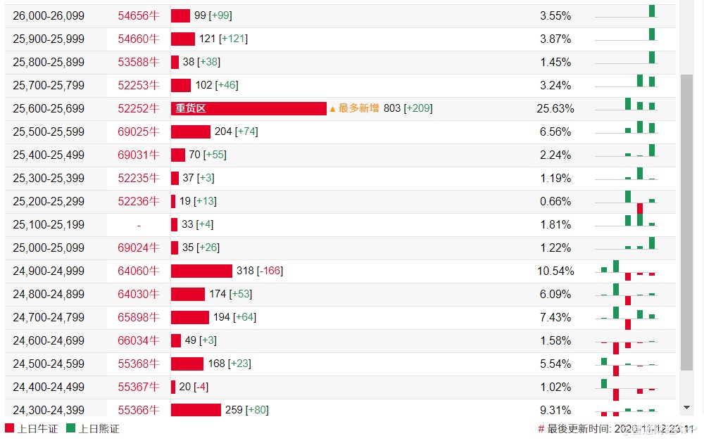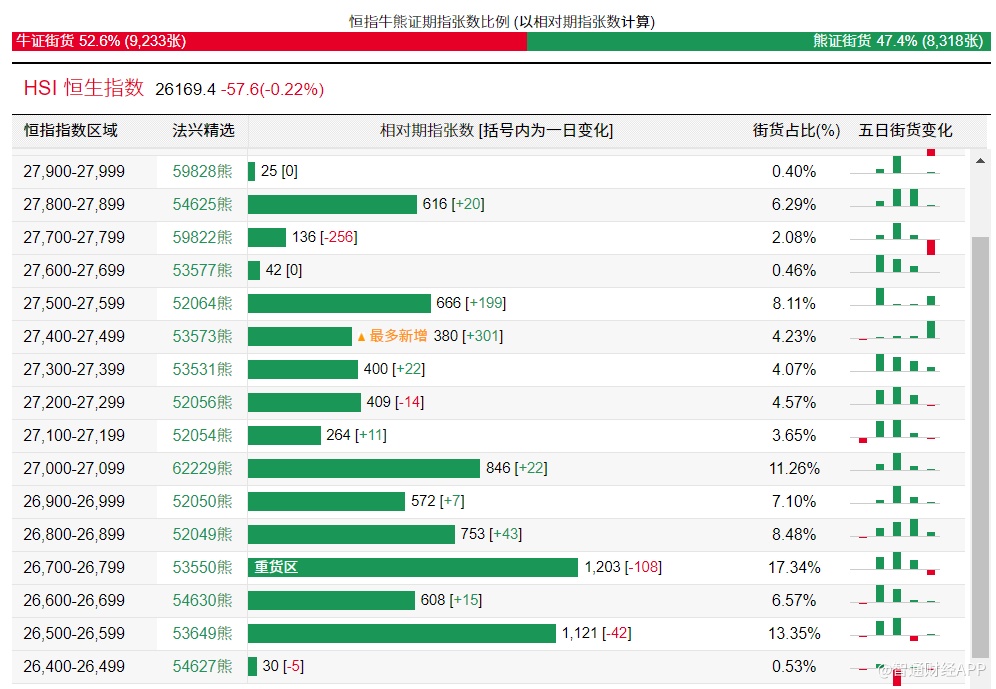 智通财经APP获悉,截至11月12日,恒指最新的牛熊街货比例53:47。法兴恒指牛熊证街货分布图中的数据显示,熊证街货重货区在26700-26799区间,该区间最新熊证数量为1203张,较上一交易日减少108张;最多新增区在27400-27499区间,该区间最新熊证数量为380张,较上一交易日增加301张。牛证街货重货区在25600-25699区间,该区间最新牛证数量为803张,较上一交易日增加209张,最多新增区也在该区间。