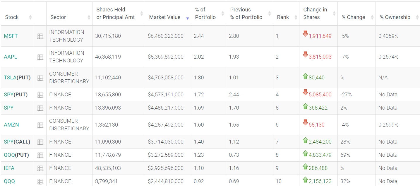 瑞银集团前五大重仓股依次是微软(MSFT.US,占投资组合比例为2.44%)、苹果(AAPL.US,占投资组合比例为2.02%)、特斯拉看跌期权(TSLA.US,PUT,占投资组合比例为1.01%)、标普500指数ETF看跌期权(SPY.US,PUT,占投资组合比例为1.72%)和标普500指数ETF(SPY.US,占投资组合比例为1.69%)。其中,瑞银集团大幅度加仓了特斯拉看跌期权。