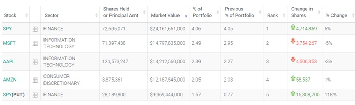 在前五大重仓股中,标普500指数ETF (SPY.US)位列第一,持仓约7269.5万股,持仓市值约241.6亿美元,较上季度持仓数量增持了6%。