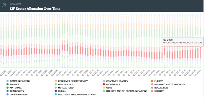 从持仓偏好来看,IT、医疗保健及金融个股位列前三,占总持仓的比例分别为20.10%,14.39%以及14.32%,其中,IT类标的占比续创新高。