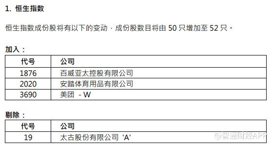 百威亚太(01876)、安踏体育(02020)、美团-W(03690)将被纳入恒生指数成份股,太古股份公司A(00019)将被剔除。成份股数目将由50只增加至 52 只。