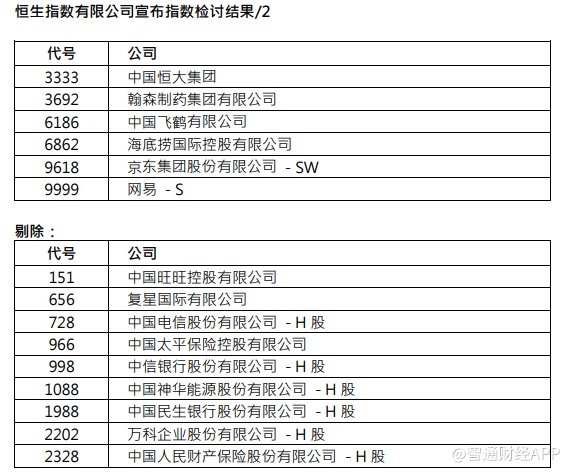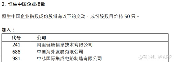 阿里健康(00241)、中芯国际(00981)、中国恒大(03333)、京东集团-SW(09618)等将被纳入恒生中国企业指数成份股,中国旺旺(00151)、复星国际(00656)等将被剔除。成份股数目维持50只。
