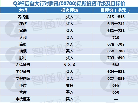 一、腾讯(00700)公布业绩后各大行最新评级和目标价