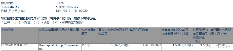 智通财经APP获悉,香港联交所最新资料显示,11月10日,美国资本集团增持永利澳门(01128)1067.04万股,每股作价13.682港元,总金额约为1.46亿港元。增持后最新持股数目约为4.77亿股,最新持股比例为9.18%。