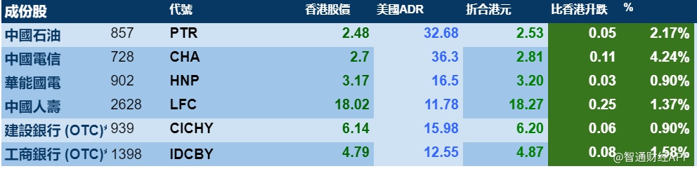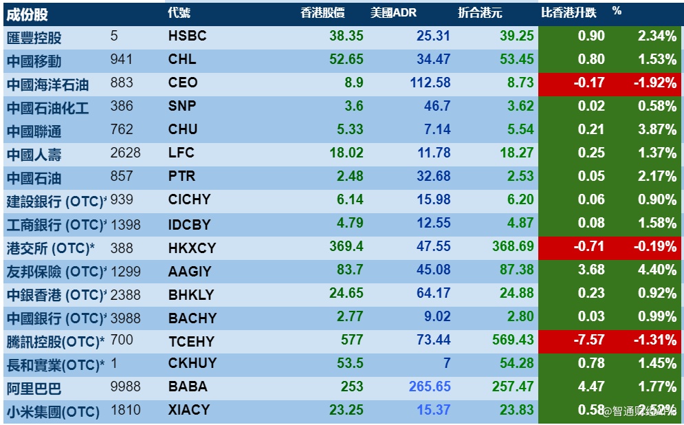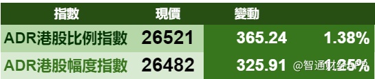 智通财经APP获悉,美股三大指数上涨,港股ADR指数上涨,按比例计算,收报26521点,涨365.24点或1.38%。