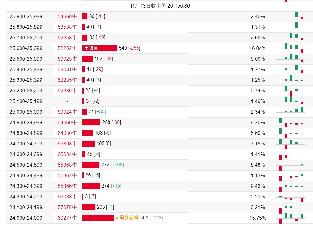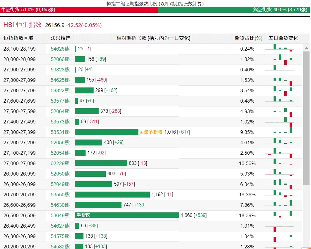 智通财经APP获悉,截至11月13日,恒指最新的牛熊街货比例51:49。法兴恒指牛熊证街货分布图中的数据显示,熊证街货重货区在26500-26599区间,该区间最新熊证数量为1660张,较上一交易日增加539张;最多新增区在27300-27399区间,该区间最新熊证数量为1016张,较上一交易日增加617张。牛证街货重货区在25600-25699区间,该区间最新牛证数量为549张,较上一交易日减少255张,最多新增区在24000-24099区间,该区间最新牛证数量为501张,较上一交易日增加123张。