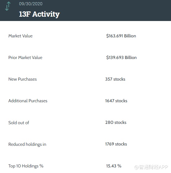 据统计,瑞士信贷三季度持仓总市值达1636.91亿美元,上一季度总市值为1396.93亿美元,环比增长17%。瑞士信贷在三季度的持仓组合中新增了357只个股,增持了1647只个股。同时,瑞士信贷还减持了1769只个股并清仓了280只个股。其中前十大持仓标的占总市值的15.43%。