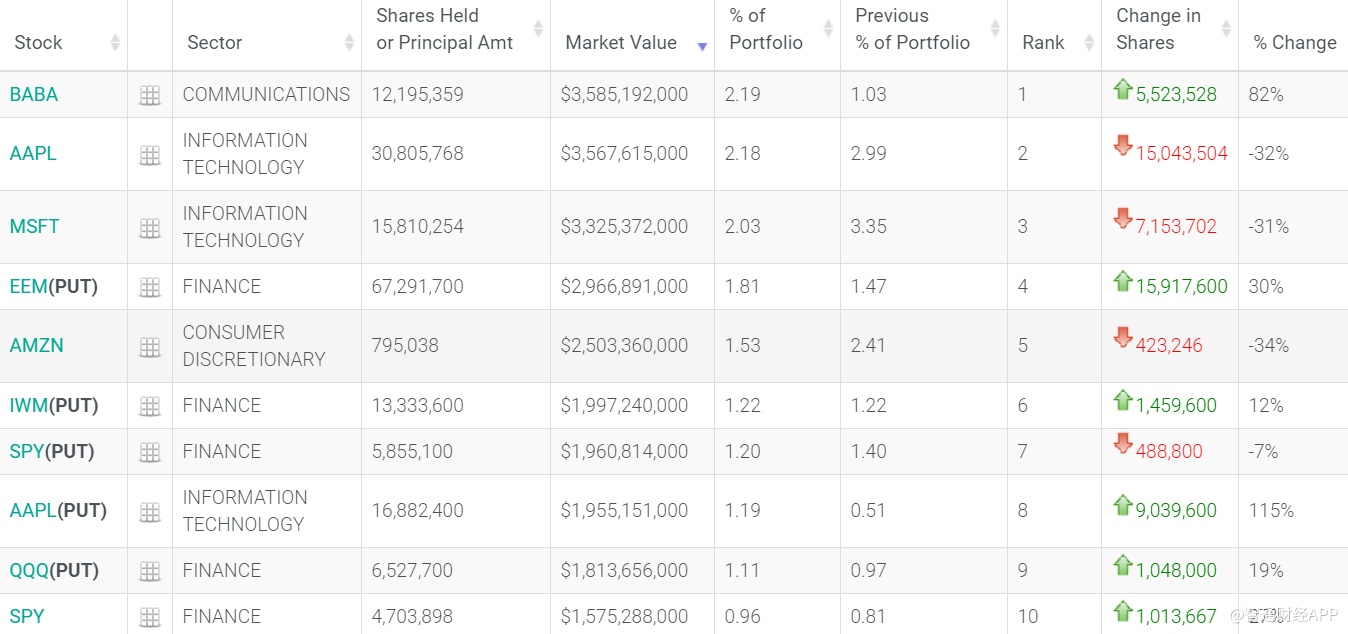 在前五大重仓股中,阿里巴巴(BABA.US)位列第一,持仓约1220万股,持仓市值约35.85亿美元。较上季度持仓数量增持82%。阿里巴巴上季度位列第七。