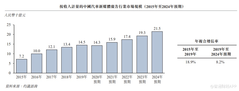 事实上,我国整个汽车广告市场已逐渐趋于饱和,据弗若斯特沙利文数据显示,从2019至2024年,汽车广告市场年复合增速仅有3.3%。不过,饱和的市场中仍有结构性的机会,网上车市所在的汽车新媒体领域便是如此。据弗若斯特沙利文数据显示,从2019至2024年,汽车新媒体广告行业的年复合增速为8.2%,较整个汽车广告行业高出近5个点。