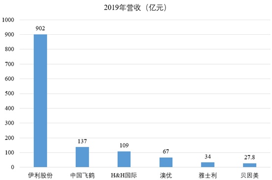 综合国产奶粉品牌或涉及奶粉业务的企业,营收规模方面,2019年伊利股份(600887.SH)营收902亿元,中国飞鹤(06186)营收137亿。从细分业务看伊利股份以液体乳产品为主,但是奶粉及奶制品收入仍然达到了100亿的规模。