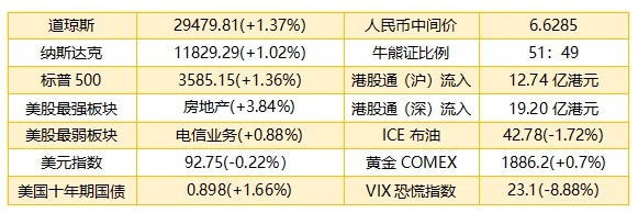 1、上周末,道指成份股思科(CSCO.US)及迪士尼(DIS.US)的业绩优于预期,带动美股周五上升,道指中段升幅扩大至超过400点。上周五截至收盘,标普500指数涨48.10点,涨幅1.36%,报3585.15点;纳斯达克指数涨119.70点,涨幅1.02%,报11829.29点;道琼斯指数涨399.60点,涨幅1.37%,报29479.81点。上周道指累计上涨4.1%,标普500指数涨2.2%,纳指跌0.6%。
