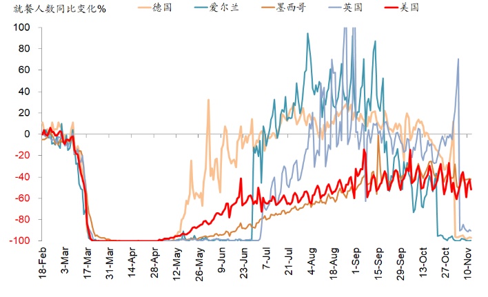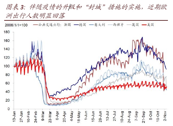 i. 短期内欧美卫生事件升级将继续拖累复工进展。对于眼下欧美持续发酵的卫生事件而言,疫苗进展仍是“远水尚不解近渴”。美国新增确诊超过18万人,是8月第二波卫生事件高峰的2倍多,欧洲卫生事件也仍未有效得到控制。美国、法国和意大利的住院人数也逼近或超过3月和8月高峰,但死亡率尚不高。从目前已经采取的防控措施看,压平曲线可能还需要几周时间,美国相对更晚,因此不可避免继续拖累本来就走走停停明显落后的复工进展(当前65%左右),进而阶段性影响市场对顺周期板块的信心。高频数据显示欧洲各国的出行和就餐等指数均大幅下挫。