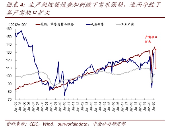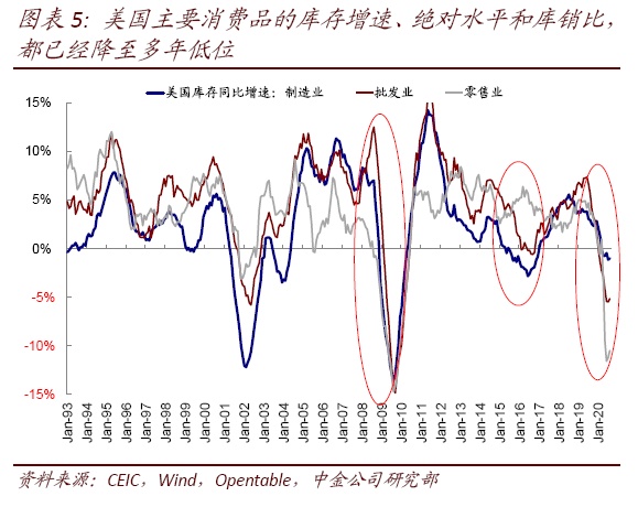 ii. 疫苗进展兜底尾部风险,有助于强化顺周期修复预期和配置逻辑。结合中金宏观组以及我们对于疫苗进展的梳理,2021年上半年疫苗有望率先在发达国家关键人群得到大范围应用,欠发达新兴市场则相对较晚。我们注意到,对于欧美国家特别是美国而言,制约其经济修复的主要瓶颈不是需求而是生产和供给。因此,如果后续疫苗进展顺利的话,那么供给修复叠加处于历史低位的库存和依然稳健的需求将加快复苏进程。