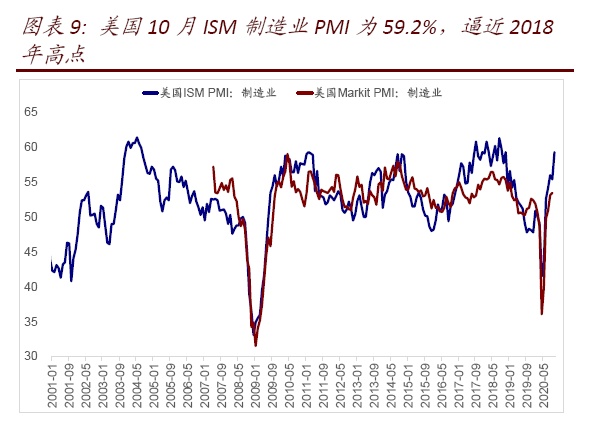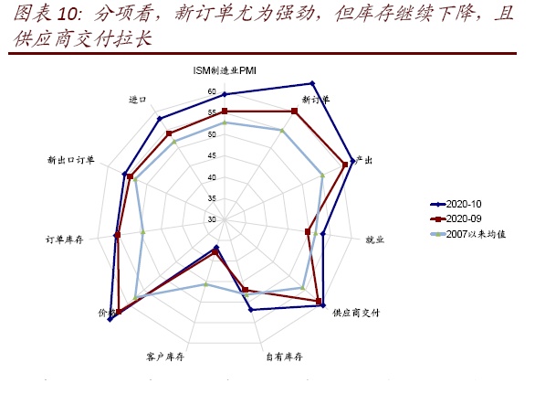 iii. 中期看,大选喧嚣过去后,新一轮财政刺激、特别是美国补库周期开启将推动增长整体修复及板块顺周期方向扩散。明年初新一任政府和国会到任后,缩小版的第二轮卫生事件财政刺激(5000亿~1万亿美元)仍有可能。更重要的是,当前处于低点的消费品库存推动补库需求将成为增长主要动力。10月美国ISM制造业PMI进一步印证了卫生事件以来美国产需缺口的扩大,59.2%逼近2018年高点,新订单尤为强劲而库存继续下降且交付时间拉长。