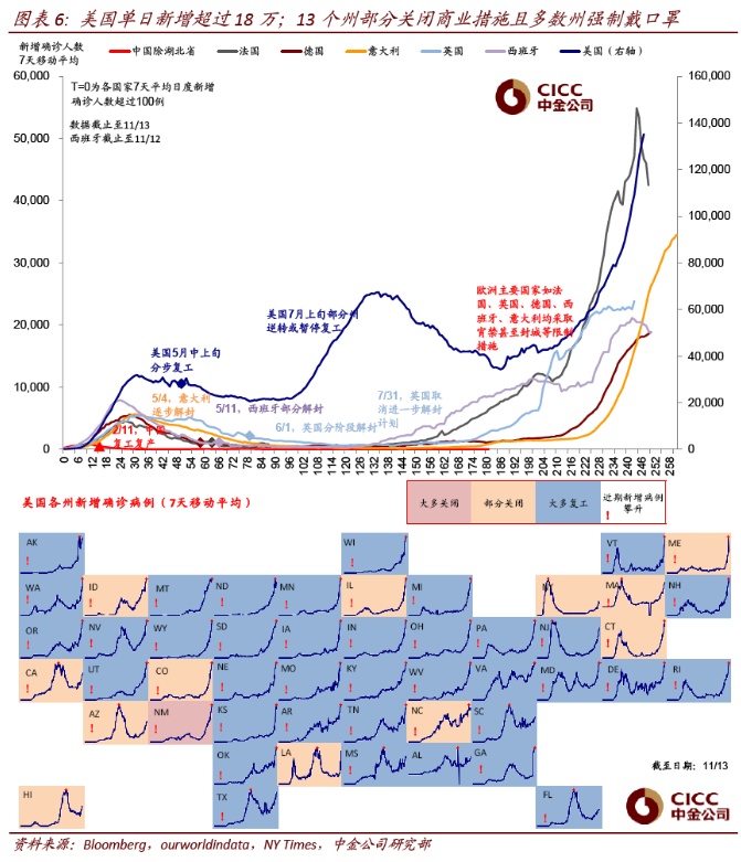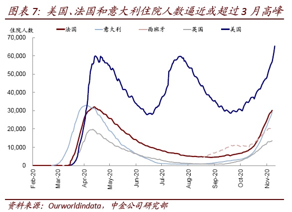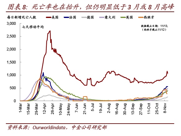 虽然疫苗的进展令人振奋,但短期美欧的卫生事件却在继续升级,体现为:1)美国单日新增一度超过18万人,超过7月底第二波卫生事件高峰(7.8万人)的两倍;法国新增确诊明显改善,但意大利仍在快速攀升。2)确诊人数的快速增加使得美国、法国和意大利的住院人数都已经逼近3月高峰。3)死亡率也在抬升,但仍明显低于3月或8月高峰值,与毒性下降和年轻人感染居多有关。4)欧洲的封城仍在继续且意大利进一步扩大了封锁范围,如果顺利的话,曲线可能在开始实施封锁后的3~4周压平;美国也有13个州部分关闭商业措施且多数州强制戴口罩,但R0仍在走高,因此压平本轮曲线时间可能相对更晚。