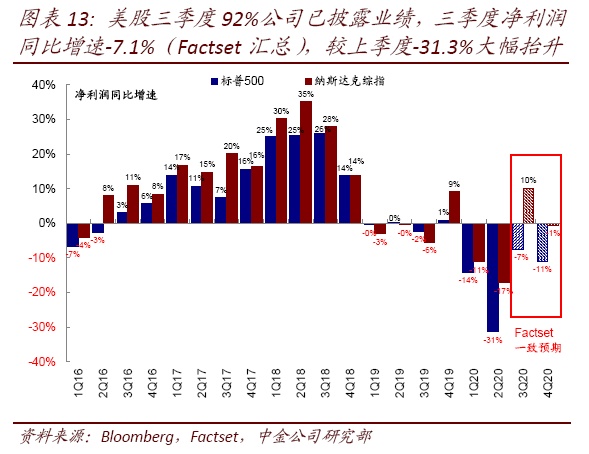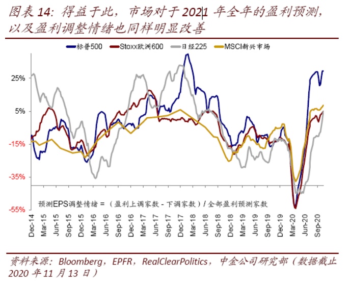 盈利层面整体向好。目前92%的美股公司已经披露了三季度业绩,超预期比例高达84%,标普500三季度净利润同比-7.1%(Factset汇总),较上季度的-31.3%大幅改善。得益于此,市场对于2021年全年的盈利预测;盈利调整情绪也同样明显改善,特别是日本。