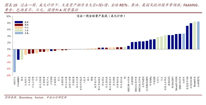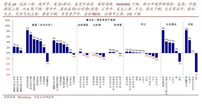 过去一周,美国大选结果基本落定叠加疫苗突破性进展的利好消息影响,全球风险资产普遍上涨,特别是受卫生事件影响大的法国和欧洲,美股市场也出现数据以来的最大流入;同时,市场风格也出现了典型的成长向价值的轮动;相比之下,美债利率快速攀升,黄金大幅回落。