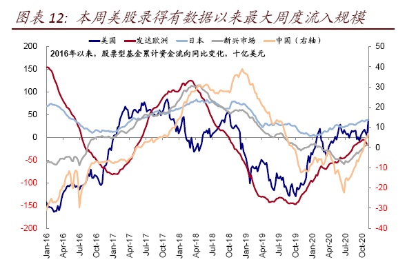 资金流向:美股有数据以来最大周度流入,新兴流入加速。过去一周,美股录得有数据以来最大周度流入,发达欧洲转为流入,新兴市场加速流入。债市方面,高收益债和信用债转为流入,利率债转为流出。