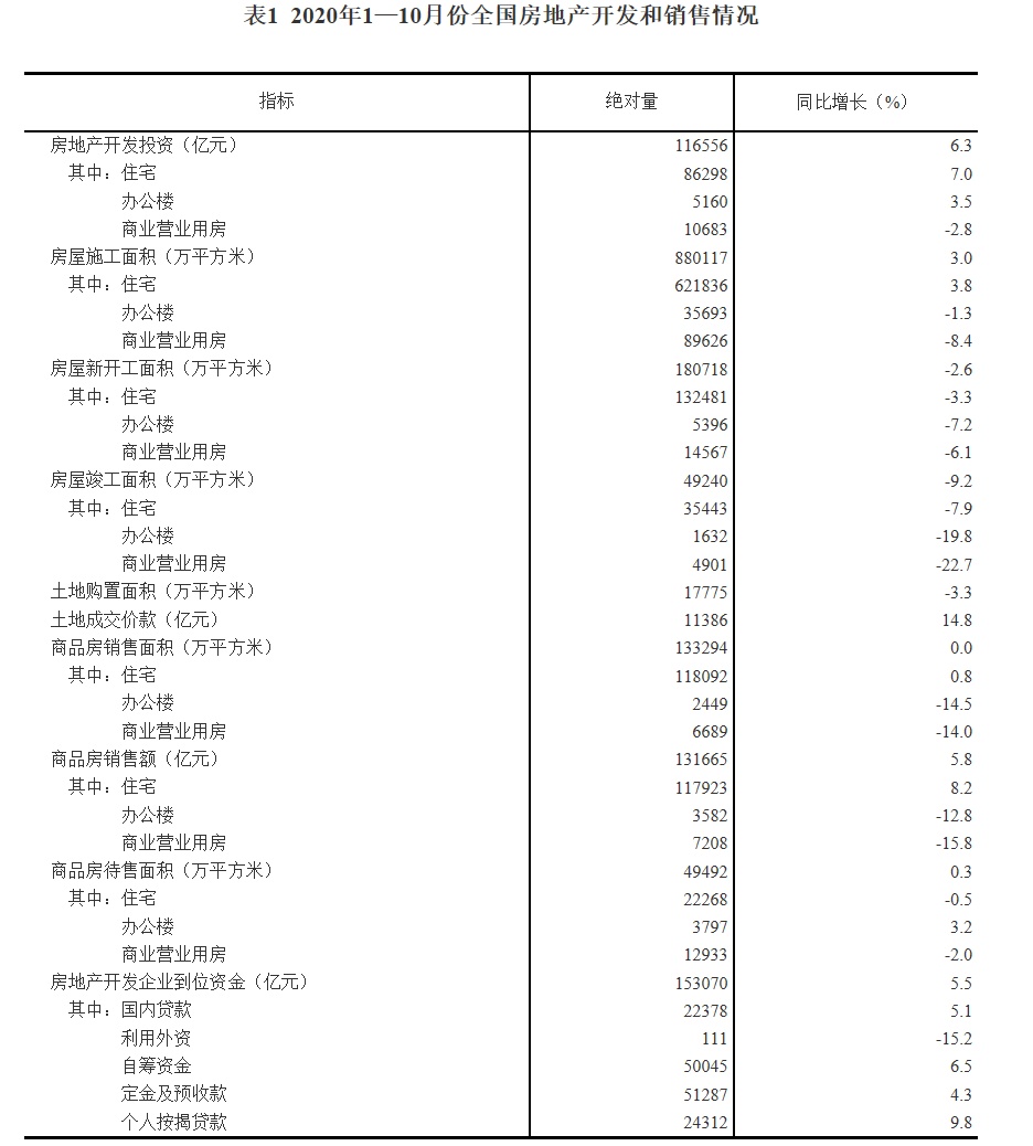 智通财经APP获悉,11月16日,国家统计局公布2020年1-10月份全国房地产开发投资和销售数据。