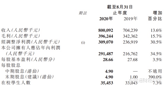 智通财经APP观察到,截至2020年8月31日止财年度,集团实现收入约8亿人民币(单位下同),同比增加13.6%;经调整净利润3.09亿元,同比增加30.5%;公司拥有人应占年内利润2.91亿元,同比增加34.5%;每股基本盈利28.66港元,拟派发末期股息每股4.9港仙,加上中期派息,全年派息比维持在30%。