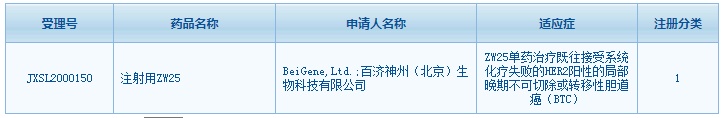 智通财经APP获悉,11月16日,中国国家药监局药品审评中心(CDE)最新公示,百济神州(06160)提交的注射用ZW25获得一项临床试验默示许可,针对的适应症为“单药治疗既往接受系统化疗失败的HER2阳性的局部晚期不可切除或转移性胆道癌(BTC)”。