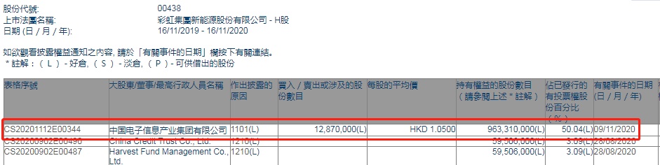 智通财经APP获悉,香港联交所最新资料显示,11月9日,中国电子信息产业集团增持彩虹新能源(00438)1287万股,每股作价1.05港元,总金额为1351.35万港元。增持后最新持股数目约为9.63亿股,最新持股比例为50.04%。