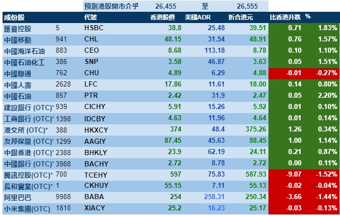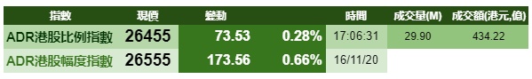 智通财经APP获悉,隔夜标普500指数和道琼斯指数涨超1%,港股ADR指数仅小幅上涨,按比例计算,收报26455点,涨73.53点或0.28%。