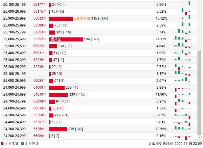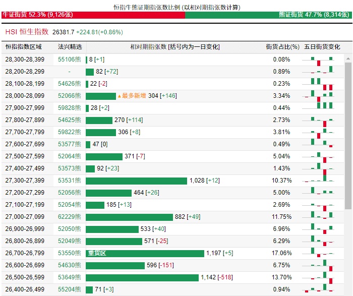 智通财经APP获悉,截至11月16日,恒指最新的牛熊街货比例52:48。法兴恒指牛熊证街货分布图中的数据显示,熊证街货重货区在26700-26799区间,该区间最新熊证数量为1197张,较上一交易日增加5张;最多新增区在28000-28099区间,该区间最新熊证数量为304张,较上一交易日增加146张。牛证街货重货区在25600-25699区间,该区间最新牛证数量为596张,较上一交易日增加47张,最多新增区在25900-25999区间,该区间最新牛证数量为415张,较上一交易日增加335张。