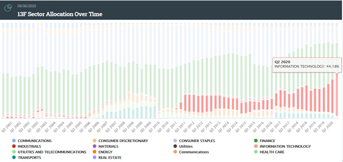 从持仓偏好来看,IT股占比达44.18%,金融股占比达32.02%。