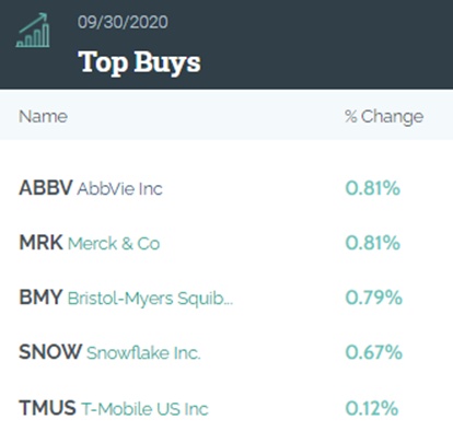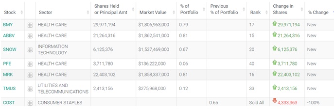 从持仓比例变化来看,前五大买入标的分别是:艾伯维、默沙东、施贵宝、Snowflake和T-Mobile。