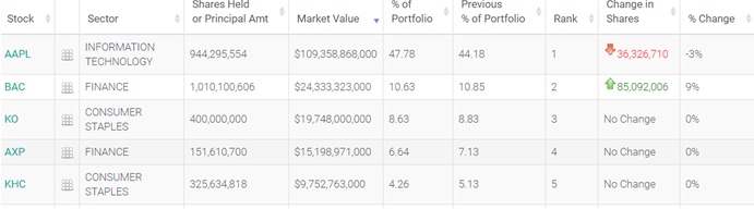 前五大重仓股分别为苹果(AAPL.US)、美国银行(BAC.US)、可口可乐(KO.US)、美国运通(AXP.US)、卡夫亨氏(KHC.US)。
