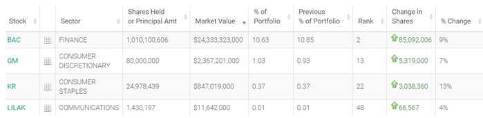 增持的个股包括美国银行、通用汽车(GM.US)、克罗格(KR.US)和通讯股的Liberty Latin America Ltd Class C(LILAK.US)。