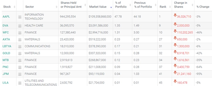减持的个股有苹果、DaVita Inc.(DVA.US)、Axalta Coating Systems Ltd.(AXTA.US)、自由全球Calss A(LBTYA.US)、巴里克黄金(GOLD.US)、Liberty Latin America Ltd Class A(LILA.US),以及金融板块的富国银行(WFC.US)、美国制商银行(MTB.US)、PNC金融(PNC.US)、摩根大通(JPM.US)。