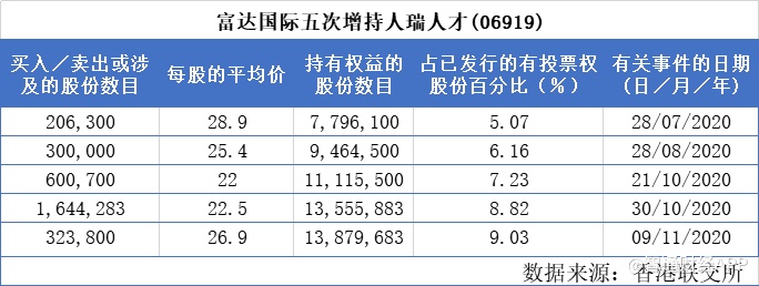 Limited)增持32.38万股,每股作价26.9港元,总金额约为872.14万港元,最新持股比例增至9.03%。