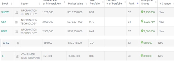 从持仓来看,第三季度,老虎环球基金新买入20只个股中主要包括Snowflake(SNOW.US),和中概股跟谁学(GSX.US)、贝壳(BEKE.US)、小鹏汽车(XPEV.US)以及理想汽车(LI.US)。