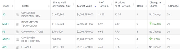 前五大重仓股分别为京东(JD.US)、微软、Facebook(FB.US)、亚马逊、阿波罗全球管理(APO.US)。