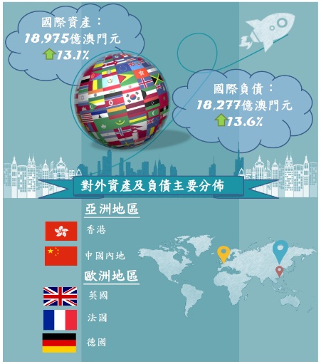 截至2020年9月底,澳门银行的国际资产总额环比上升1.2%,同比上升13.1%,金额为18975亿澳门元(合2377亿美元);其中,对外资产同比上升11.3%至14142亿澳门元,而本地外币资产增长18.9%,金额为4832亿澳门元。作为国际资产主要组成部份的外地非银行贷款增加15.8%,金额达6589亿澳门元。