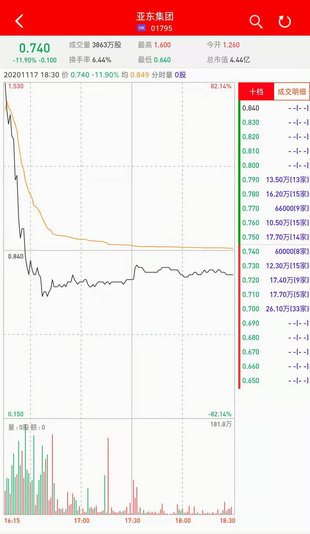 智通财经APP获悉,亚东集团(01795)将于11月18日在香港挂牌,截至暗盘收盘,利弗莫尔证券资料显示其暗盘报价0.74港元,较招股价0.84港元跌11.9%。每手3000股,不计手续费,每手亏300港元。