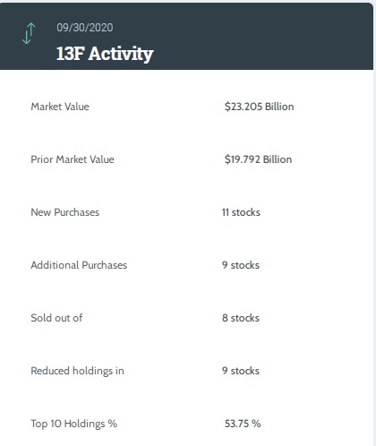 三季度,孤松资本持仓总市值为232.1亿美元,上一季度为197.9亿美元,环比增长17.2%。持仓新增标的11只,增持9只标的,减持9只标的,并对8只标的进行了清仓处理。截止至2020年9月30日,该基金前十大持仓标的占总市值的53.75%。