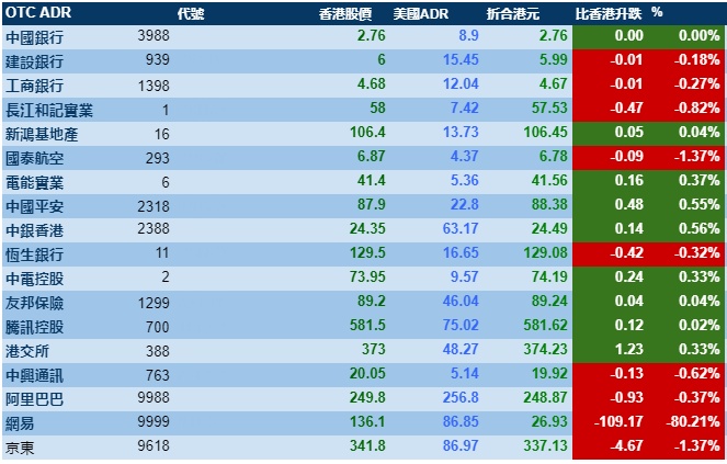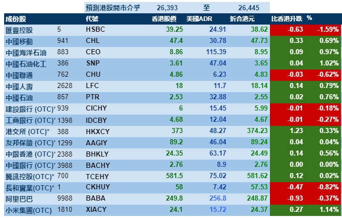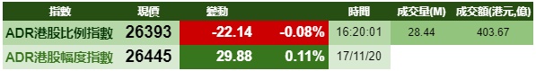 智通财经APP获悉,隔夜美股小幅下跌,港股ADR指数跟随下跌,按比例计算,收报26393点,跌22.14点或0.08%。