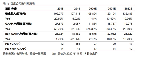 目前路透一致预期公司 2020/21/22 年收入 1059/1201/1322 亿元,non-GAAP净利润 186/221/263 亿元,当前价对应 PE 分别为 17/14/12 倍,估值已经充分反映在线广告业务增速放缓、市场竞争持续加剧等短期悲观预期,中期潜在的股价催化剂包括:在线广告业务恢复正增长、新业务商业化落地加速、公司通过回购&派息加大股东回报力度、爱奇艺亏损持续收窄等。