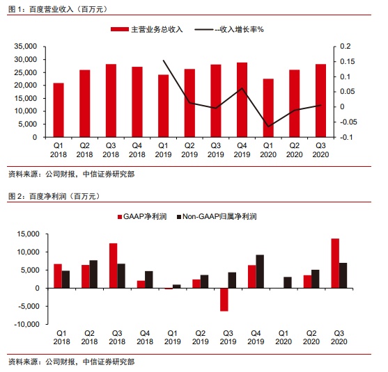 整体业绩超预期,宣布收购 YY 国内业务。2020Q3 公司收入 282.3亿元(+1%,环比+8%),继续延续二季度的复苏进程,并实现收入正增长,其中广告业务收入 202.0 亿元(-1%,环比+14%),其他业务收入 80.3 亿元;按业务板块,百度 core 收入 213.8 亿元(+2%,环比+13%)、爱奇艺收入 74.1亿元(同比-3%,环比-3%)。当季 GAAP 净利润 136.8 亿元(同比扭亏,环比+282%),Non-GAAP 净利润 69.9 亿元(+59,环比+38%),除费用端的持续优化外,公司本季度毛利率大幅提升至 54.6%(+13pcts,环比+5pcts),主要源自 APP、管理页带来内部流量提升,流量成本下降。同时,公司宣布以 36亿美元现金的价格收购 YY 直播国内业务(YY 移动 APP、YY.com 以及 PC 版YY),意在加强直播与视频业务。在公共卫生事件影响逐步明朗的情况下,公司预计2020Q4 收入 286~313 亿元,对应同比增速-1%~8%,其中百度 core 业务增速区间 -1%~10%,大概率在四季度录得正增长。